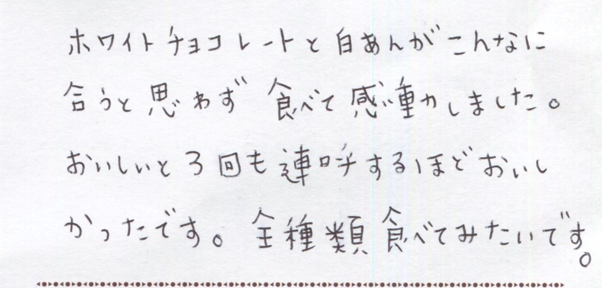 埼玉から7時間、鈍行列車に乗って買いに行きました。栗あじの巣ごもりが美しかったので、また購入したいです。ヤフーショッピングでお取り扱いを希...