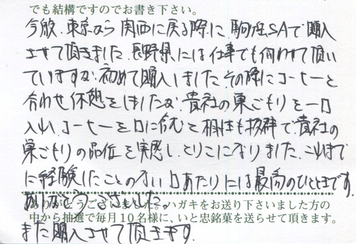 今般、東京から関西に戻る際に、駒ケ岳SAで購入させて頂きました。長野県には仕事でも伺わせて頂いていますが、初めて購入しました。その際にコーヒーと合わせ休憩をしましたが、貴社の巣ごもりを一口入れ、コーヒーを口に含むと相性も抜群で、貴社の巣ごもりの品位を実感し、とりこになりました。これまでに経験したことのない口あたりには最高のひとときです。ありがとうございました。