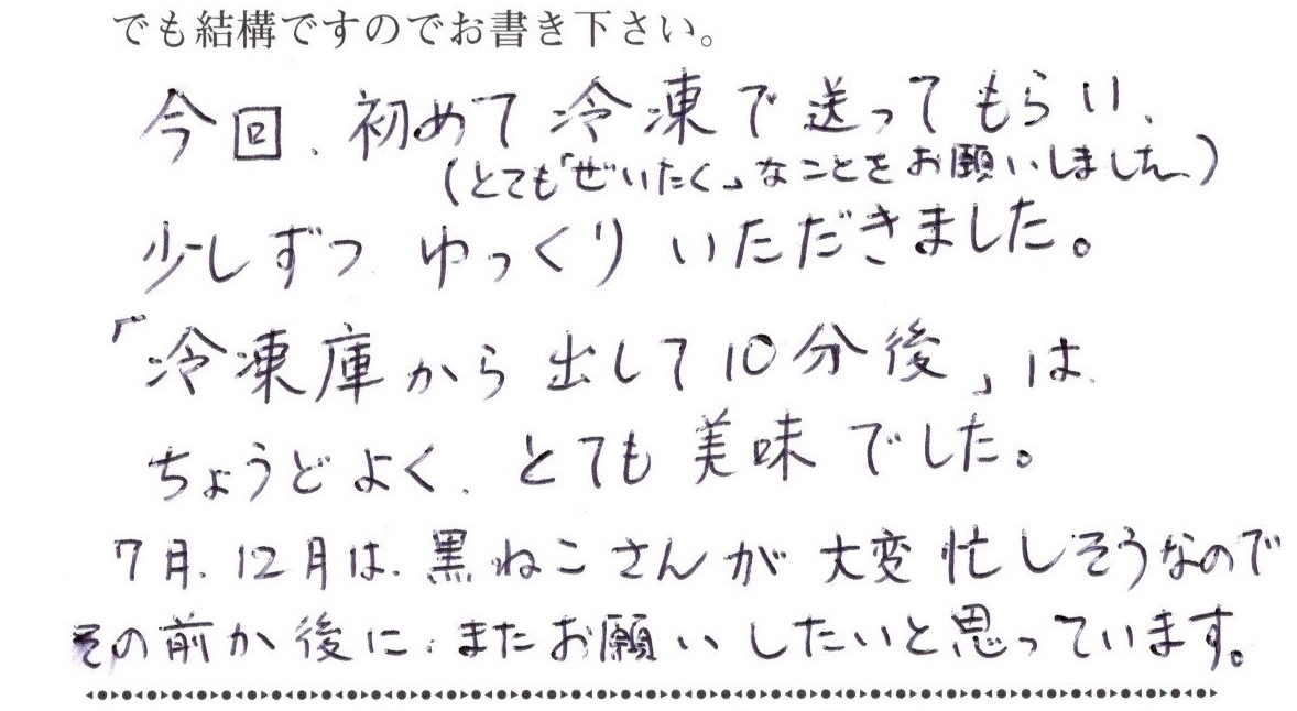 今回、初めて冷凍で送ってもらい、(とても「ぜいたく」なことをお願いしました。)