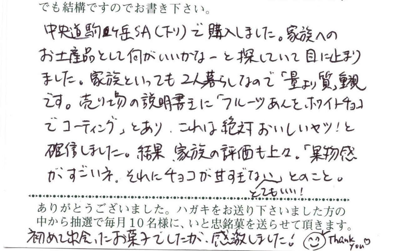 中央道駒ケ岳SA(下り)で購入しました。家族へのお土産品として何がいいかなーと探していて目に止まりました。家族といっても2人暮らしなので「量より質」重視です。売り物の説明書きに「フルーツあんをホワイトチョコでコーテイング」とあり、これは絶対おいしいヤツ!と確信しました。結果、家族の評価も上々。