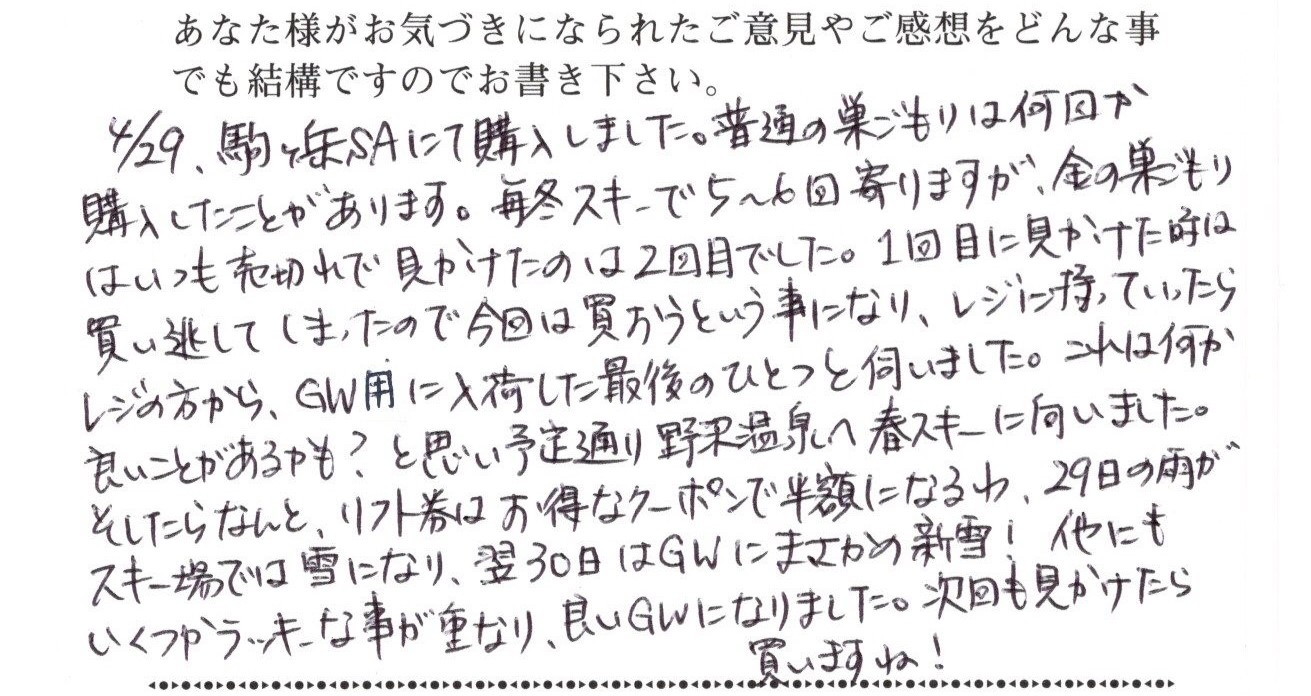 4/29、駒ケ岳サービスエリアにて購入しました。普通の巣ごもりは何回か購入したことがあります。毎冬スキーで5~6回寄りますが、金の巣ごもりはいつも売切れで、見かけたのは2回目でした。1回目に見かけた時は買い逃してしまったので、今回は買おうという事になり、レジに持っていったら、レジの方から、ゴールデンウイーク用に入荷した最後のひとつと伺いました。これは何か良いことがあるかも?と思い、予定通り野沢温泉へ春スキーに向かいました。