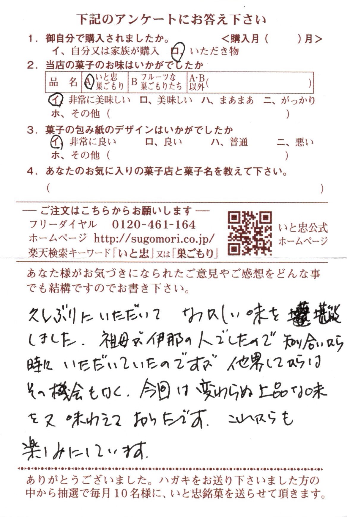 初めて栗あん巣ごもりを頂きました。栗の甘さとホワイトチョコのコーティング最高です。又の機会に知人にもお伝えしていきたいと思ってます。今後も...
