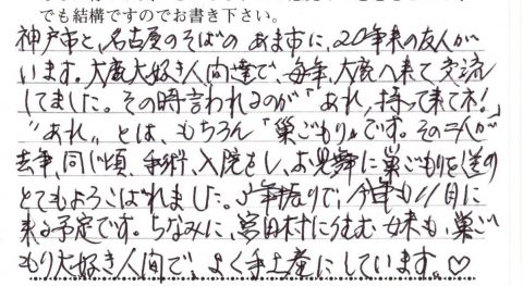 “あれ”とは、もちろん「巣ごもり」です。その二人が去年、同じ頃、手術、入院をし、お見舞いに巣ごもりを送り、とてもよろこばれました。3年振りで、今年も11月に来る予定です。ちなみに、宮田村に住む妹も巣ごもり大好き人間で、よく手土産にしています♡