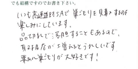 季節限定のフルーツや栗などの巣ごもりも美味しく楽しみにしています。 巣ごもりは口当たりも良くて、贈りものとしても、とても喜ばれていて、...