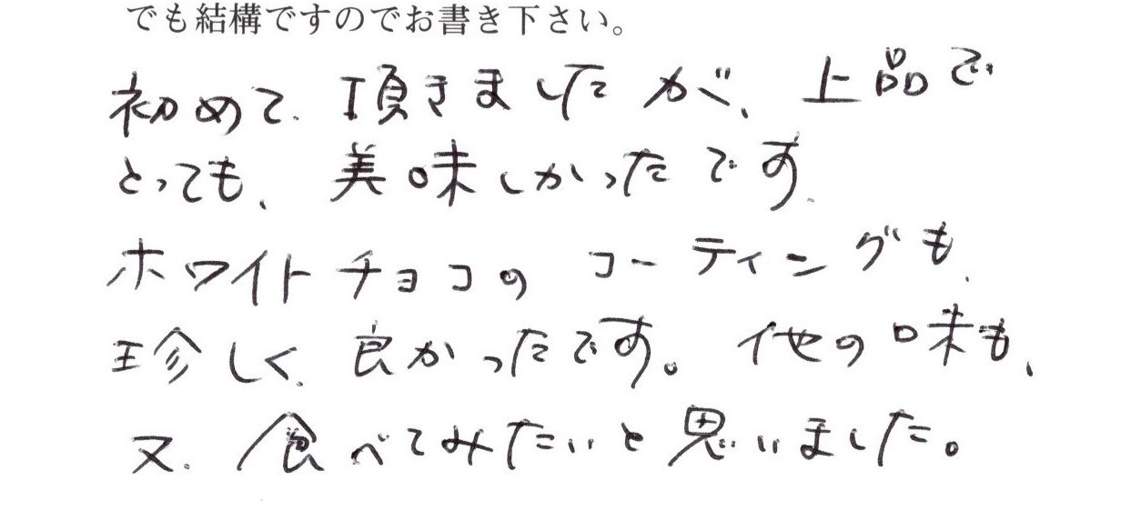 長野に旅行に行った際、駒ケ岳SAで初めて購入しました。今までにない味と、食感で、食べたことのないおいしさに感動しました。ホワイトチョコレー...