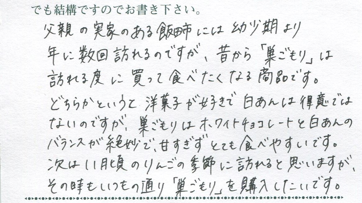 父親の実家のある飯田市には、幼少期より年に数回訪れるのですが、昔から「巣ごもり」は訪れる度に買ってたべたくなる商品です。