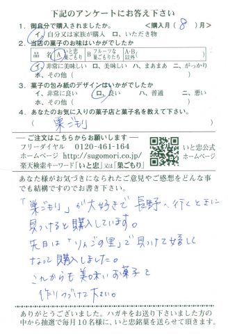 長野の方から頂きました。和、洋ミックスした感じで、お茶、コーヒーにも良く合いとてもおいしく頂きました。フルーツな巣ごもりも食べてみたくなり...