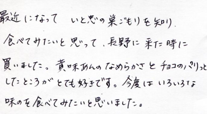 巣ごもりは、飯田方面へ旅行した際によく買っています。冷やして食べるのが好きで、ずっしりとしたあんのまろやかさに、いつもとても幸せな気持ちに...