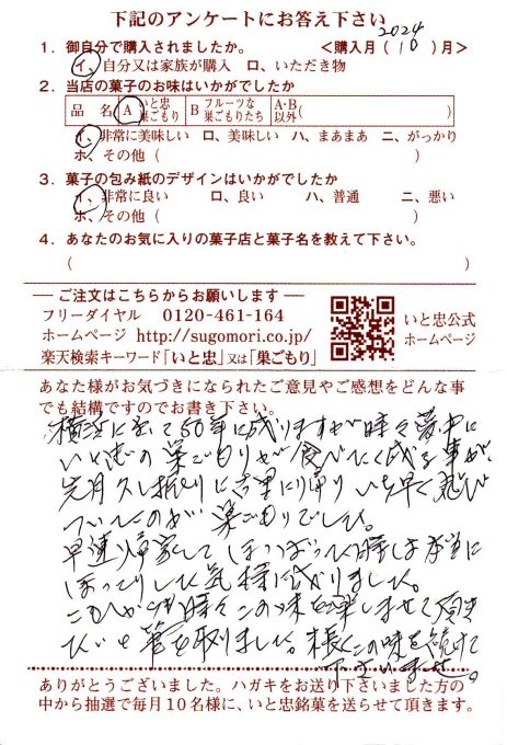 短大時代を長野県飯田市で過ごしました。そのときに「いと忠巣ごもり」に出会い、その美味しさに魅了されました。帰省の際には、必ず家族へのお土産...