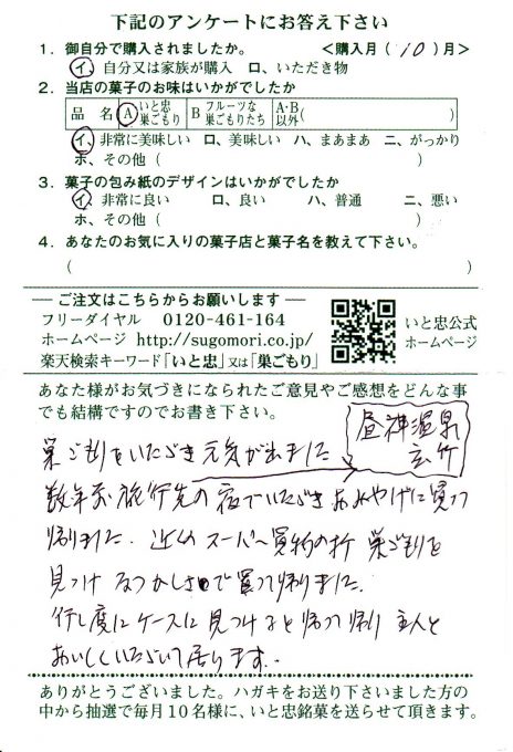 20数年前「巣ごもり」に出合い、感動でした。諏訪湖SAを通る時は、必ず求め、楽しみました。その後フルーツな巣ごもりたち、うれしかったです。...