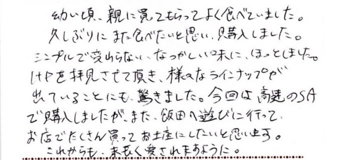 HPを拝見させて頂き、様々なラインナップが出ていることにも驚きました。今回は高速のSAで購入しましたが、また飯田へ遊びに行ってお店でたくさん買ってお土産にしたいと思います。