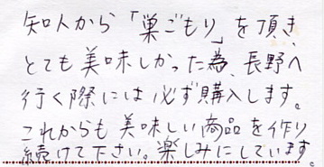 約10年前にお土産で頂いてからの大ファンです。仕事で飯田市へ出張の時は、必ず買って家族で美味しくいただいています。今後も美味しいお菓子作り...