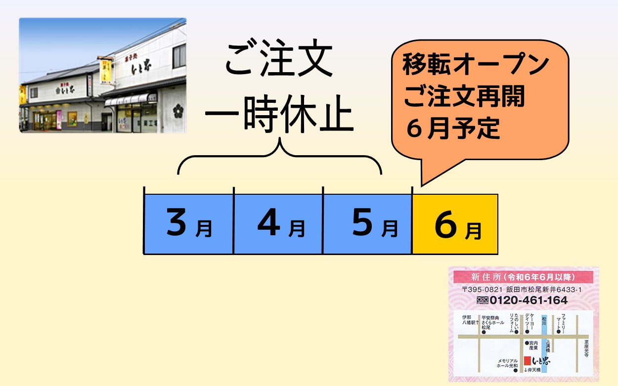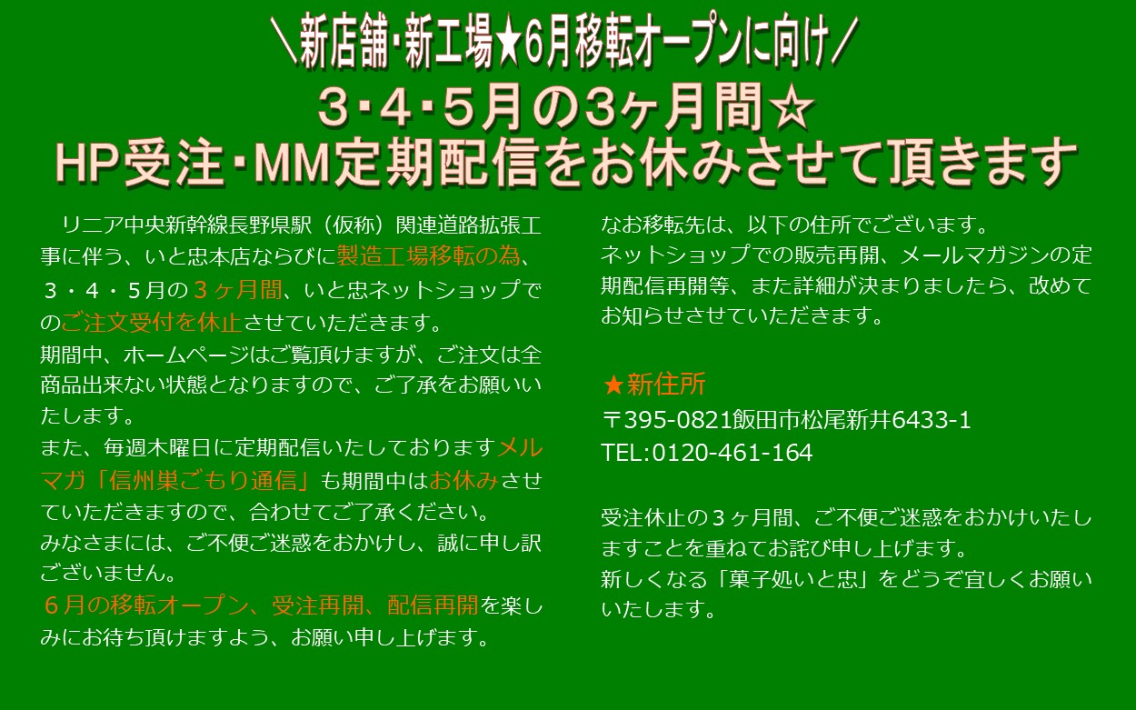 新店舗・新工場6月移転オープンに向け、3・4・5月、ご注文受付休止のお知らせ