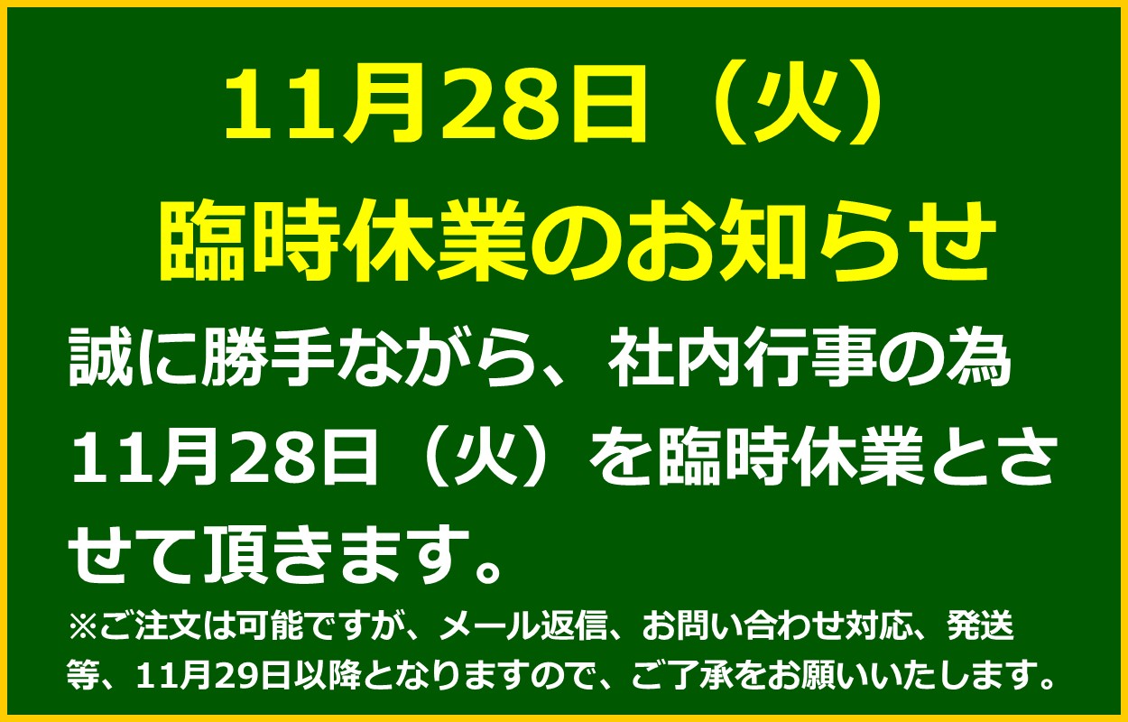 誠に勝手ながら、社内行事の為11月28日(火)を臨時休業とさせて頂きます。